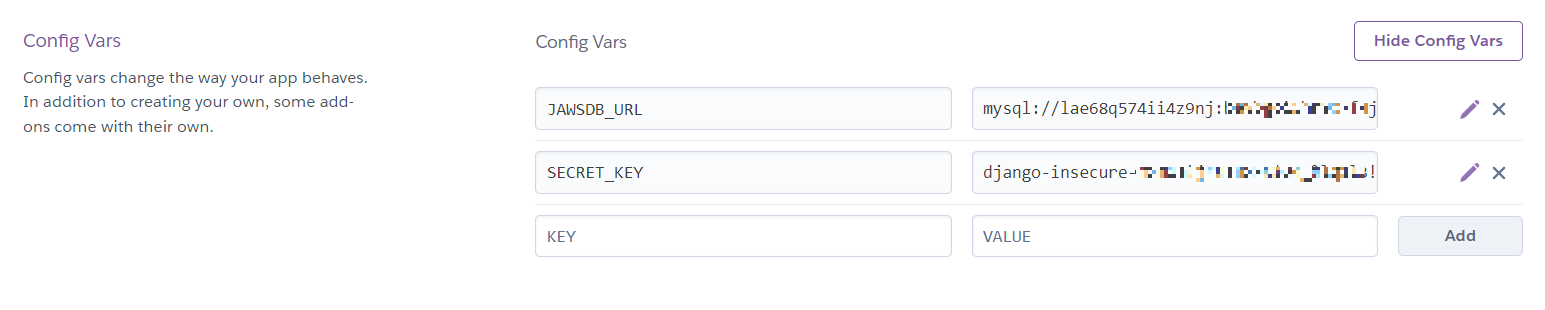 [Settings] - [Config Vars] - [Reveal Configs Vars] 순서로 들어가주면 된다.